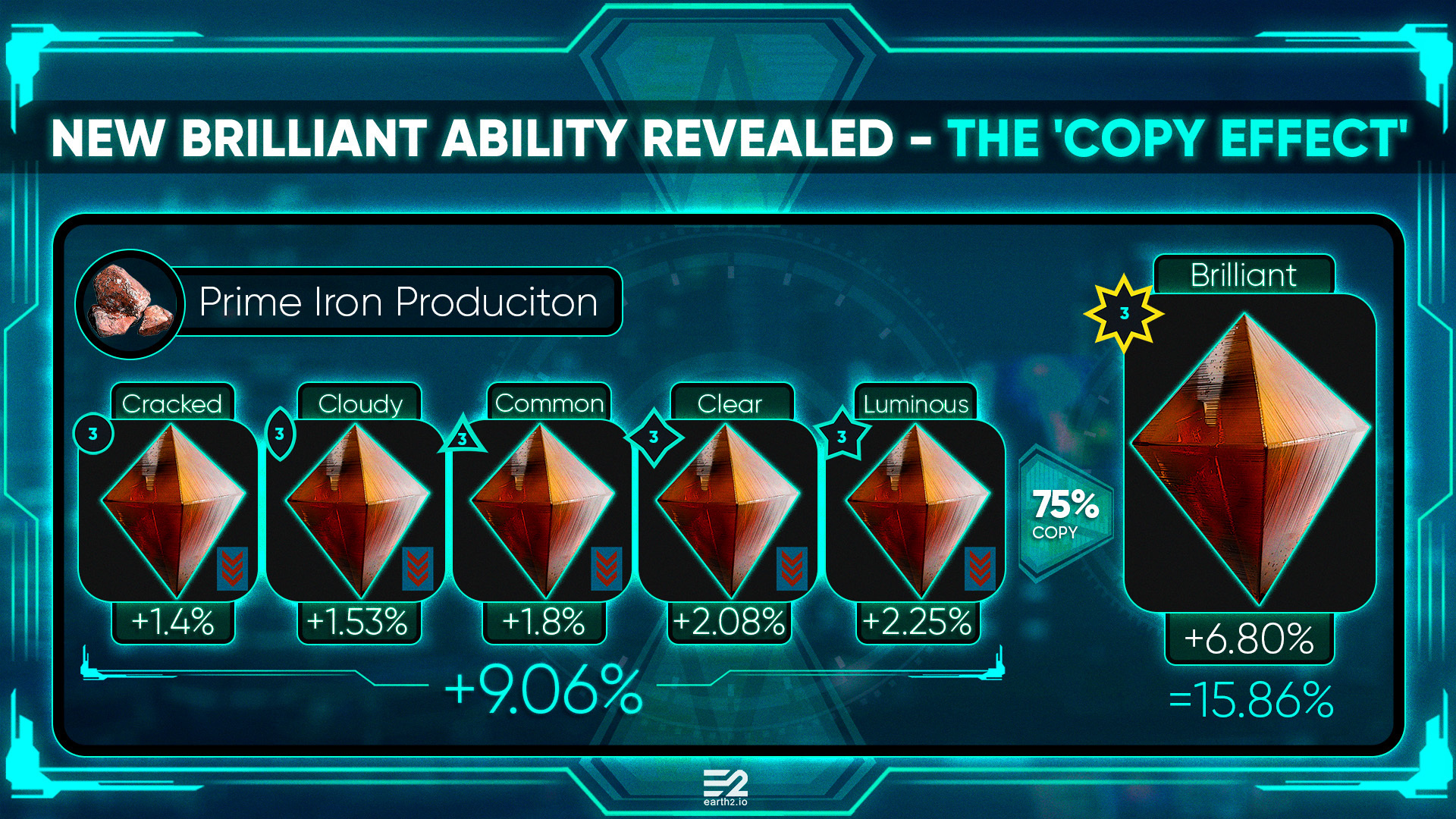 Brilliant의 티어는 COPY Effect의 다양한 레벨을 제공합니다. 범위는 25%에서 75%입니다. 동일한 색상의 Brilliant 2개를 장착하면 COPY Effect가 향상되지만, 복합 비율은 감소합니다. 즉, Brilliant를 더 많이 장착할수록 Brilliant 1개만 장착했을 때보다 항상 더 많은 COPY Effect를 얻을 수 있지만, Brilliant를 추가할 때마다 개별 COPY Effect는 감소합니다. 그럼에도 불구하고, 거의 100%의 Copy Effect를 달성하여 기본 장착 효과를 사실상 두 배로 늘릴 수 있습니다!!
