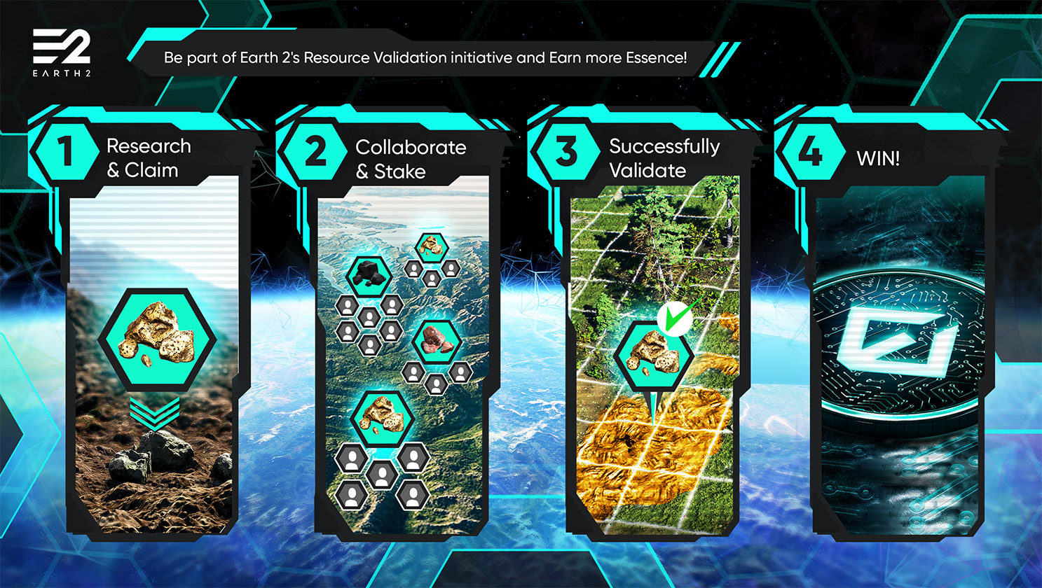 Essence를 늘리고자 하는 플레이어는 이 E2PVR 이니셔티브를 활용하고 공식 Discord 서버의 전용 #resource-validation-collab 채널(https://discord.gg/earth2)에서 토론하고 협력하여 신규 플레이어를 도울 것을 권장합니다.
