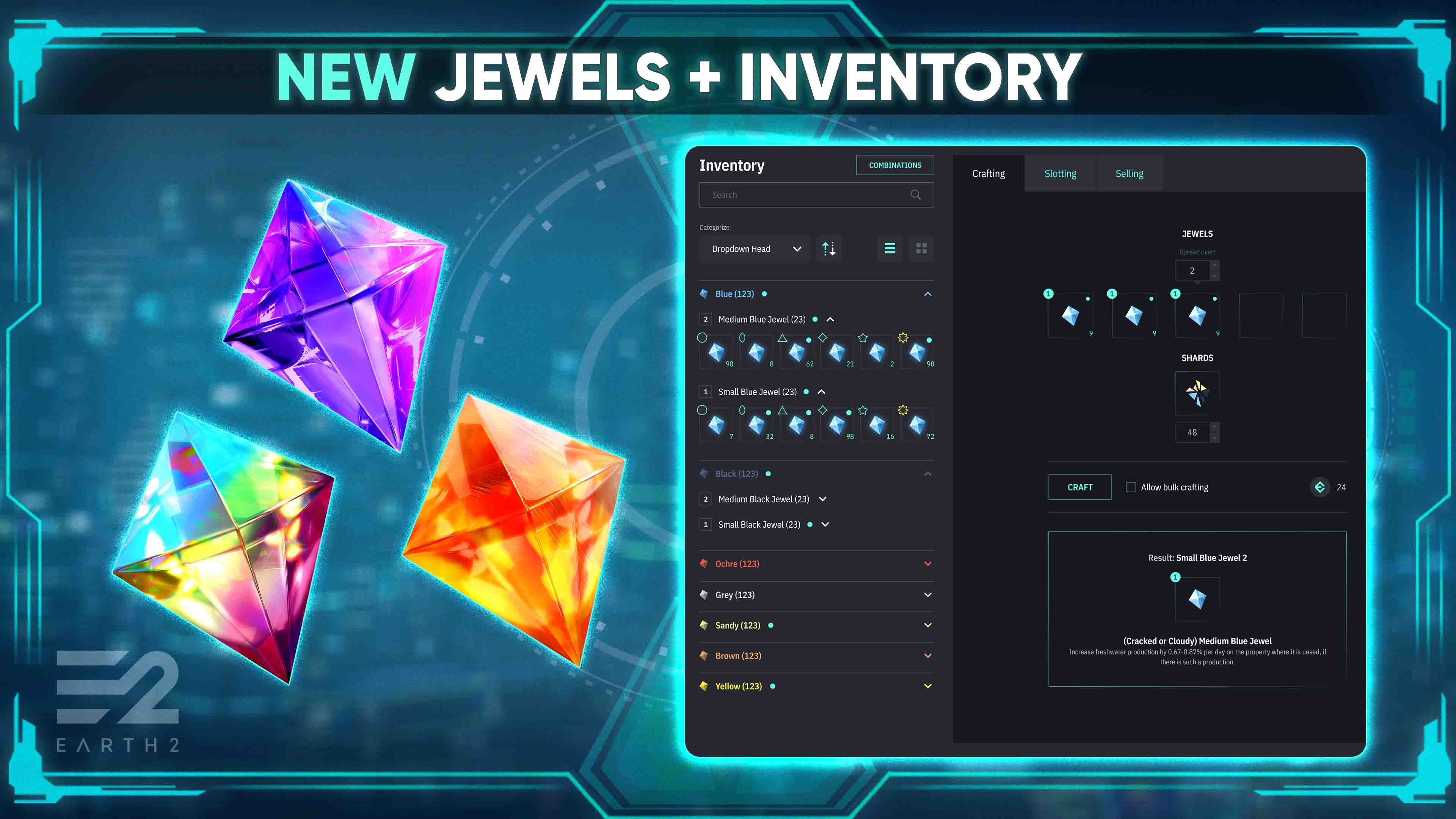 Jewel 인벤토리의 새로운 UI는 Earth 2 내에서 Jewel이 가지고 있는 다양한 유틸리티를 수용하도록 설계 및 구축되었습니다. 특히, 플레이어가 다양한 부스트 효과를 위해 Jewel을 Cydroid에 장착할 수 있도록 하는 곧 출시될 Cydroid 관리 시스템을 고려했습니다.