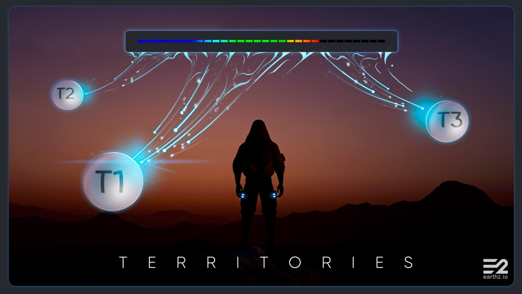 Territories는 주, 지방 또는 카운티와 같이 Earth 1에서 이미 경계가 설정된 미리 결정된 토지 영역입니다. 대부분 국가에 의존하거나 국가의 일부를 형성합니다. Territories의 도입은 지금까지 Earth 2에서 볼 수 없었던 것으로, 각 Territory 출시는 활성 Earth 2 플레이어가 제출한 투표에 의해 독점적으로 결정됩니다.