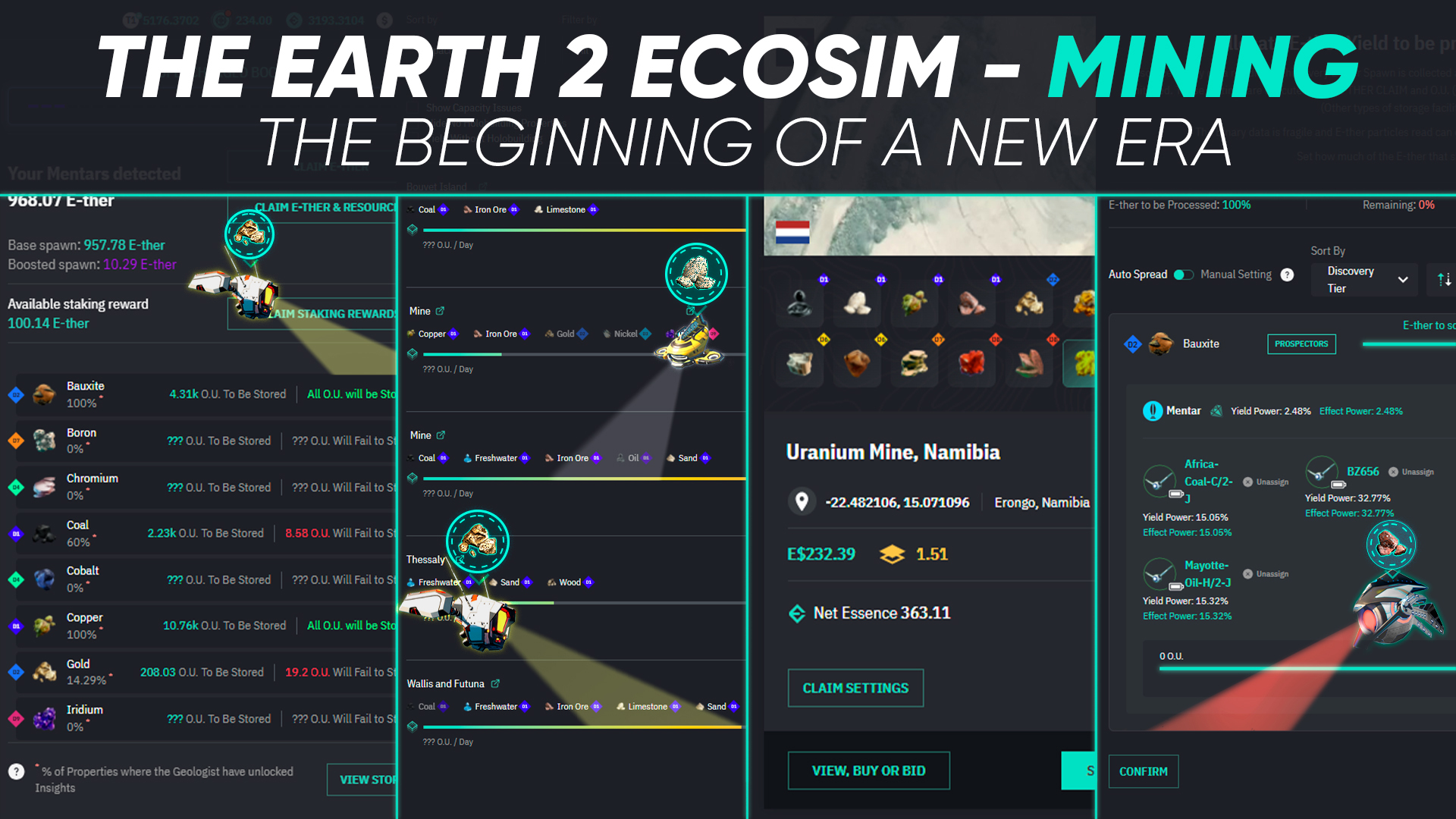 在认领 E-ther 和 Resource 时,玩家能够看到哪些 Resource 将从该特定认领中成功产出。虽然 E-ther 和 Resource O.U. 可以从玩家的整个土地组合中集体认领,但从每个贡献地产获得的值将被累积并记入原始地产的本地存储。如果没有地质学家受雇于至少一个地产,则为每个 Resource 显示的集体 O.U. 值也可能被隐藏或不准确。同样,在地产上没有地质学家不会影响 O.U. 产出,但会影响为该地产提供的见解。